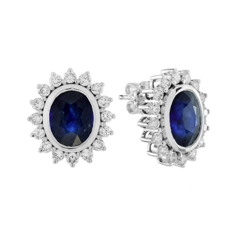 Princess Earrings with bezel Set Sapphires 7.51 Carats & Diamond 1.18TW Set in 14KT White Gold
