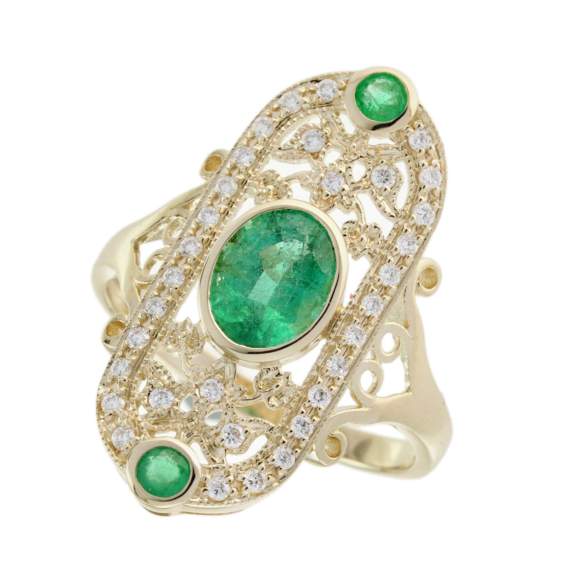 Vintage Style Filigree Ring with Center Emerald .95, Side Emeralds .12TW & Diamonds .19TW Set in 14KT Yellow Gold